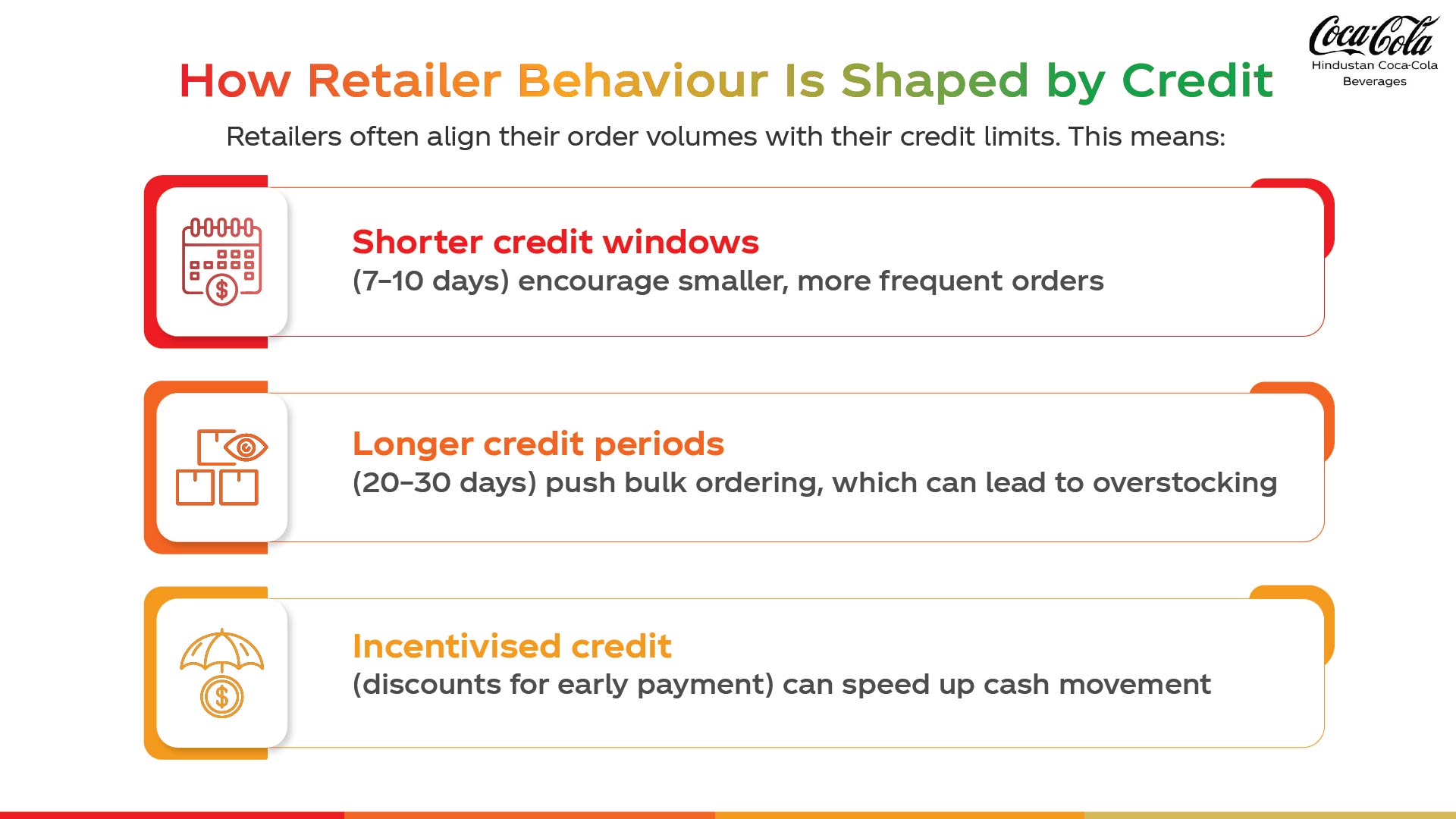 Credit periods are set in line with how quickly products sell in each market. If a beverage typically sells through in 12 days, the credit term mirrors this cycle to prevent overstocking and delayed payments.